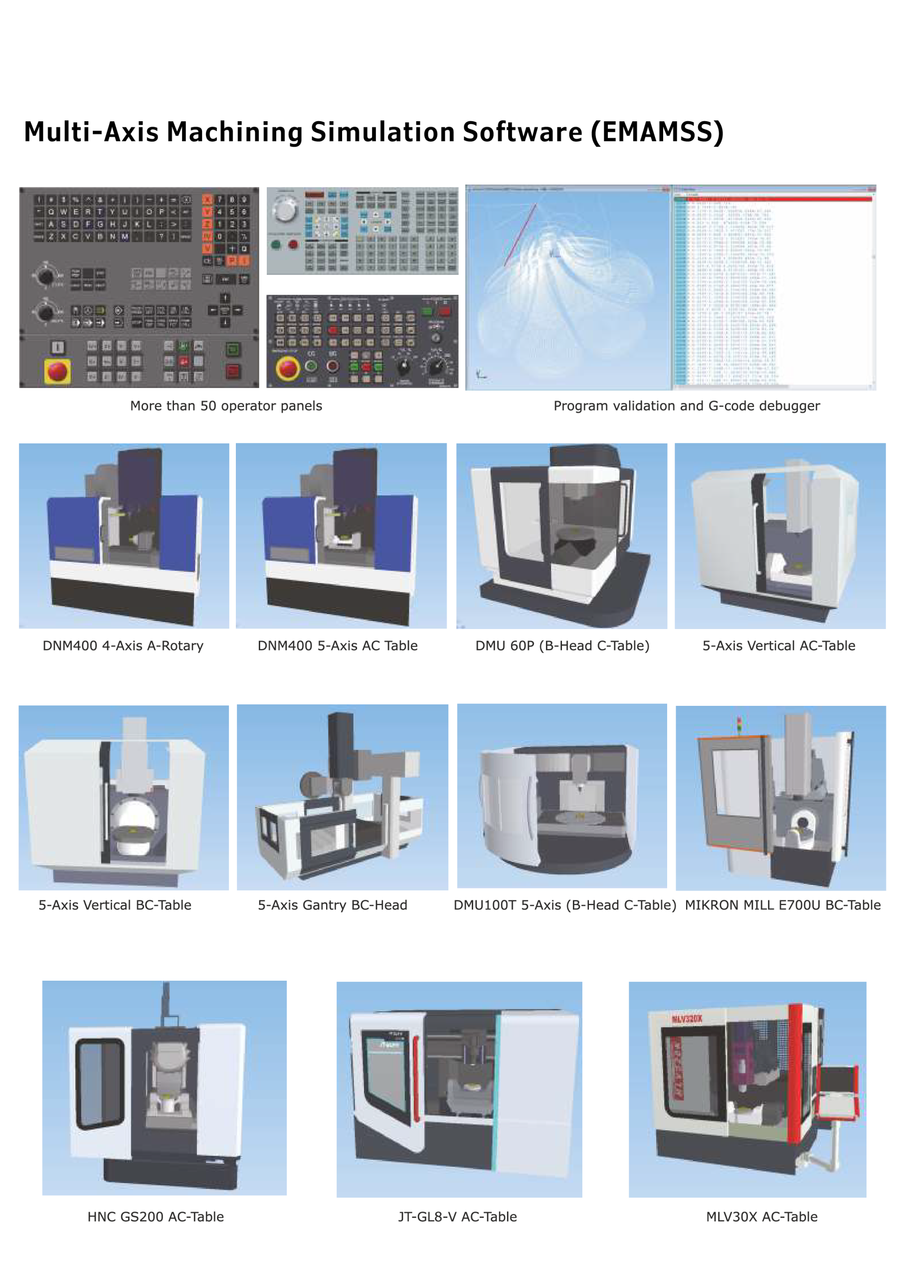 (G code) and auxiliary function code( M code) and other instructions. - Support for 4 and 5 axes CNC machines. 5 axes machine involves AC dual rotary worktable structure, BC Axis dual rotary worktable structure, BC single swing head and single rotary worktable structure and BC Axis dual swing heads structure.